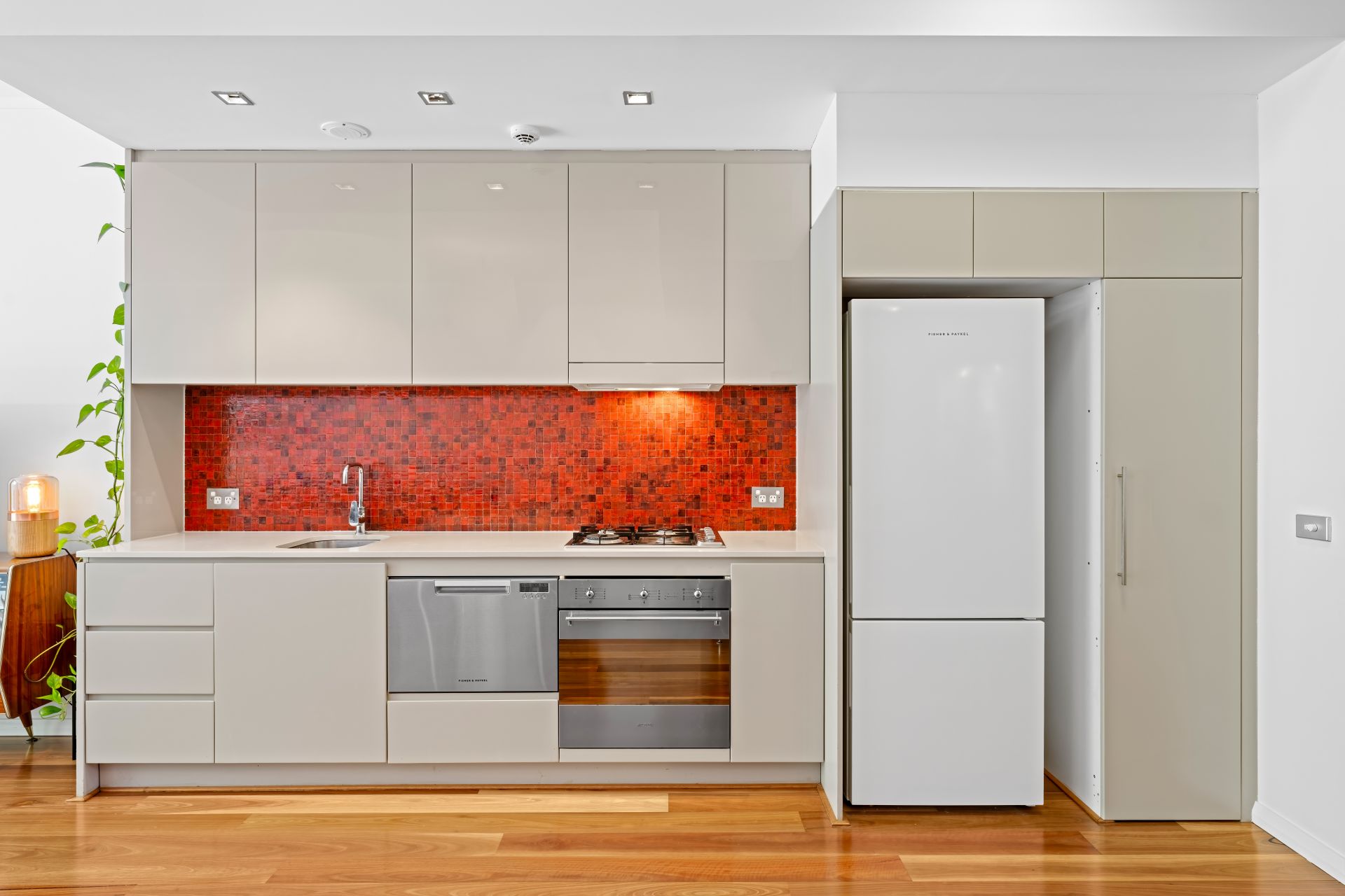 - Sleek gas kitchen with stainless-steel appliances, dishwasher, and ample storage
