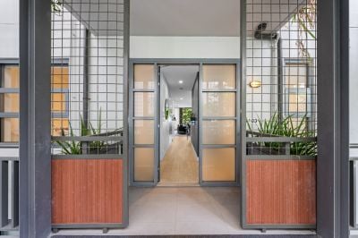 - Sleek modern gas kitchen with stone benchtops, abundant storage, integrated fridge and dishwasher, complemented by timber flooring through the kitchen, living and entry area