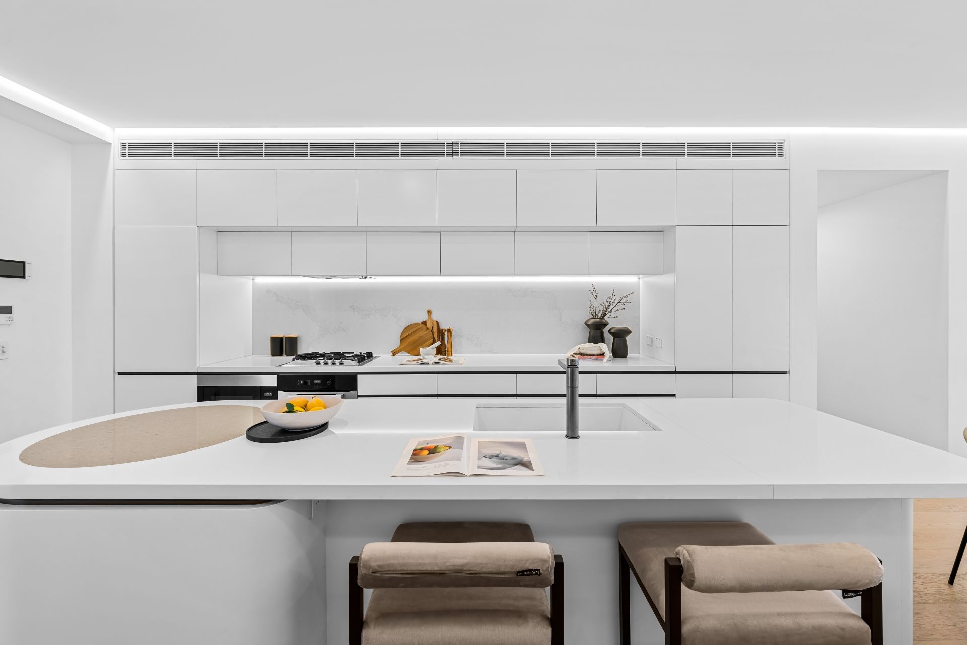 - Designer stone kitchen with island bench, gas cooking, integrated appliances and ample storage