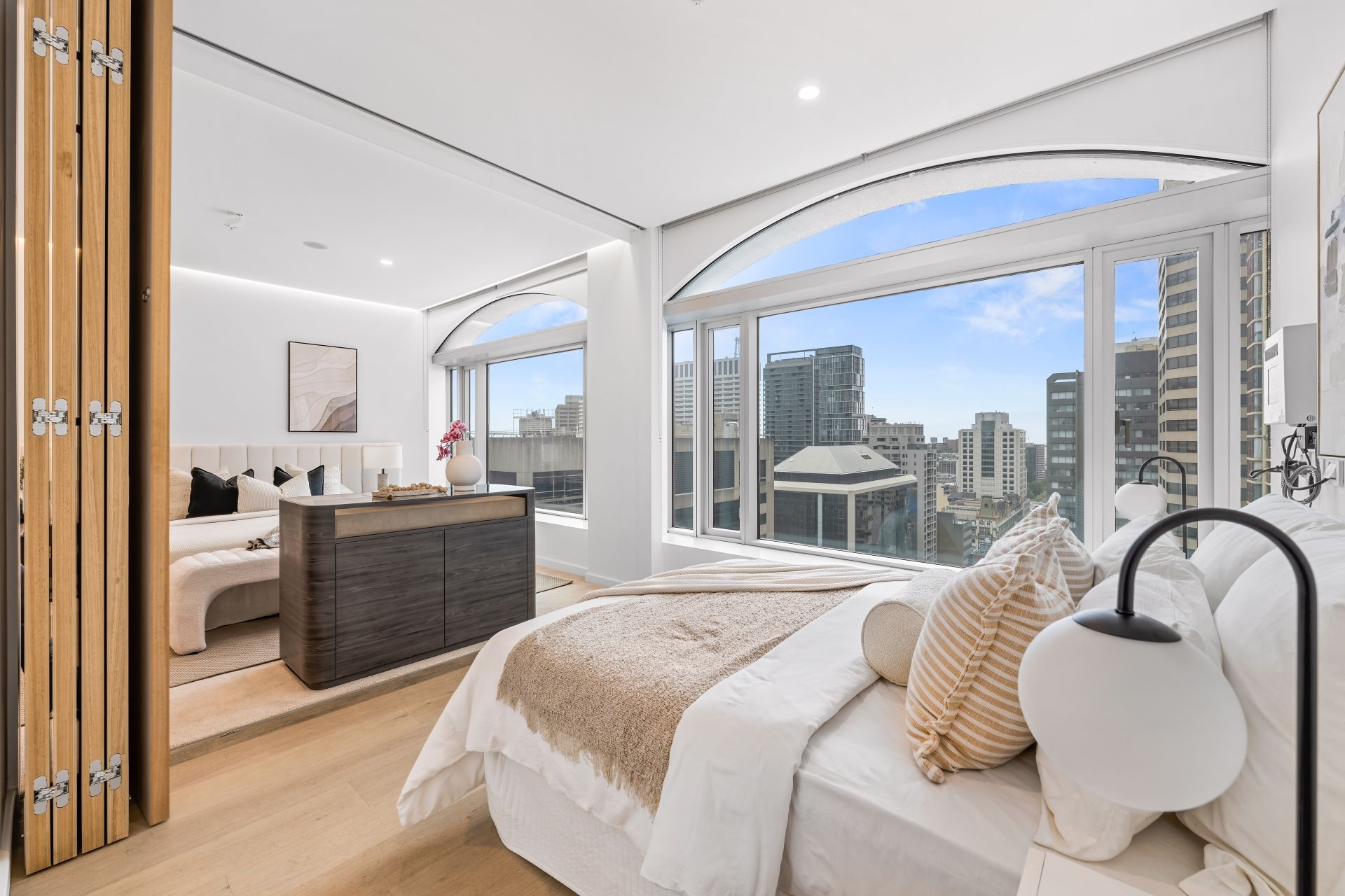 - Expansive open plan living and dining area framed by signature curved windows capturing panoramic city views